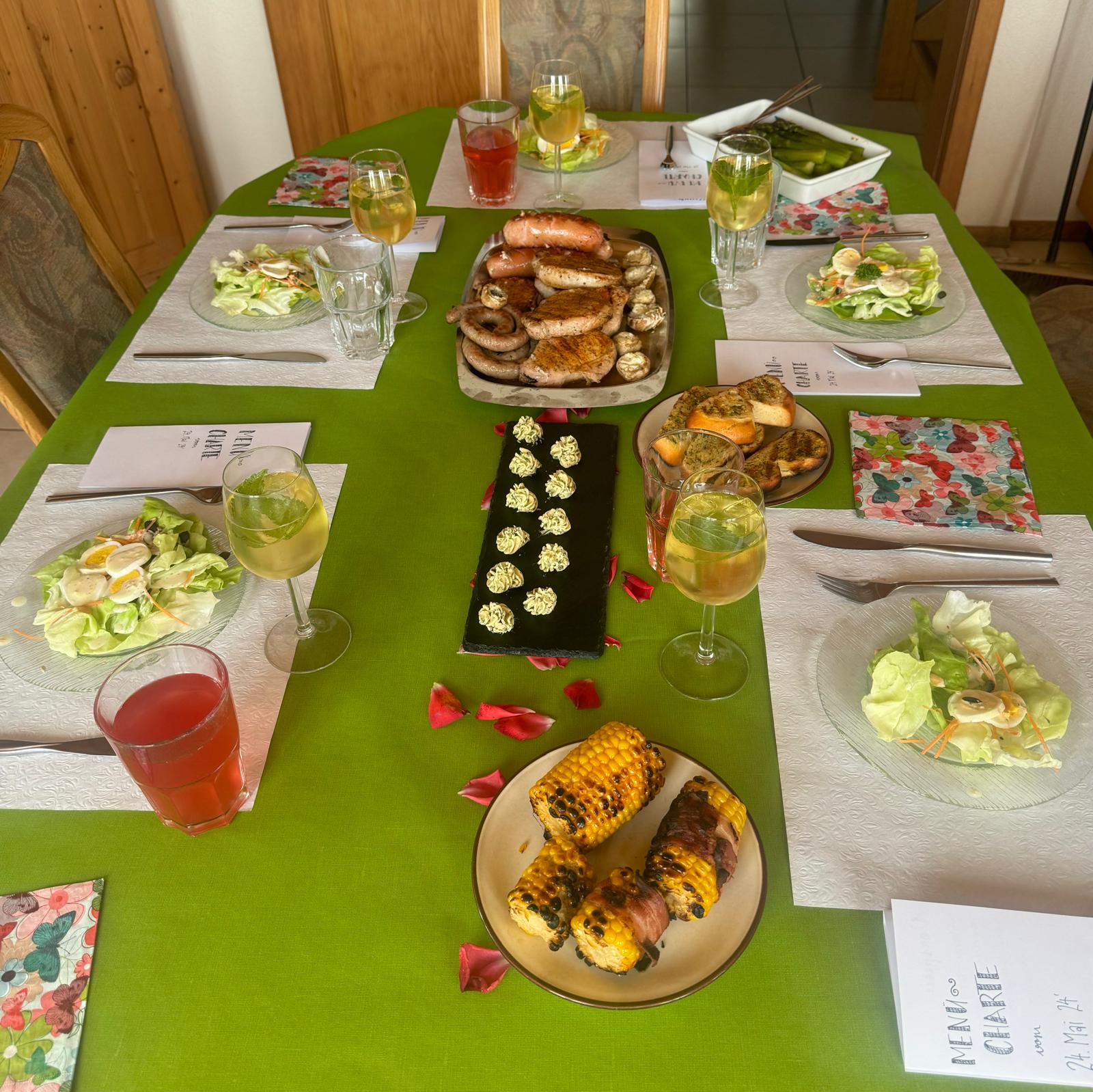 Das Highlight vom Freitagmorgen war, dass endlich schönes Wetter war und meine Chefin und ich unser Projekt durchführen konnten. Wir wollten ein ganzes Menü auf dem Grill kochen. Der Sohn meiner Chefin hat nämlich einen Grill selbst konstruiert, den meine Chefin schon lange mit mir ausprobieren wollte. Als Erstes haben wir im Grill Feuer gemacht, damit wir zum Kochen eine schöne Glut hatten. Wir haben Rezepte gegoogelt, die man auf dem Grill zubereiten kann. Wir waren sehr erstaunt, was es alles für leckere Sachen gibt, die man grillieren kann. Ich habe dazu viele inspirierende Sachen gelesen, auf die ich mich direkt gefreut habe, sie auszuprobieren. Zur Vorspeise haben wir uns entschieden, dass wir Knoblibrot machen. Dazu gab es Kopfsalat mit Karotten und Eiern garniert. Beim Knoblibrot musste ich aufpassen, dass das Brot nicht allzu trocken wurde. Zum Hauptgang haben wir viele verschiedene Sachen zubereitet. Es gab Maiskolben im Speckmantel, gefüllte Champignons, Cervelats, Bratwurstschnecken, Steak und Kartoffeln. Letzteres hat nicht so funktioniert, wie wir es uns vorgestellt haben. Wir haben weichkochende Kartoffeln gewählt. Diese haben wir eingeschnitten und mit Olivenöl, Salz und einem Stängel Rosmarin in Alufolie eingepackt. Wir hatten nur Glut im Grill, doch die Kartoffeln sind uns nach kurzer Zeit leider schon verkohlt. Das nächste Mal machen wir es besser. Was aber sehr beliebt war, waren die Champignons mit der Tartarefüllung. Zum Trinken durfte ich einen Drink in festlichen Gläsern servieren. In diesen Drink kam Holunderblütensirup, Apfelschorle, Mineral und Eiswürfel. Für das perfekte Aroma und die Dekoration haben wir noch Minzenblätter in die Gläser verteilt. Alle liebten den Drink, da es sehr erfrischend war, und es an diesen Tag ausnahmsweise sehr warm war. Zum Fleisch haben wir noch Kräuterbutter zubereitet. Er war sehr lecker gewürzt. Da uns die Kartoffeln verkohlt sind, gab es zum Hauptgang Chips. Ich habe mich sehr gefreut, dass ich denn Tisch zur Feier des Tages schön dekorieren durfte. Auch gab mir meine Chefin Zeit, Menükarten schön zu gestalten. Zum Dessert war das Ziel, dass wir drei verschiedene Sachen zubereiten. Es wurde aber von der Zeit her knapp und wir haben uns entschieden nur zwei Sachen zu machen. Geplant wäre noch ein Erdbeersoufflé gewesen. Es gab Erdbeerspiese mit Marshmallows. Das zweite Dessert waren Bananenschiffli. Bei den Marshmallows mussten wir aufpassen, dass sie nicht zu brennen anfingen. Es war jedoch die perfekte Kombination zu den Erdbeeren. Die Bananeschiffli haben alle geliebt. Anschliessend haben wir uns an das Aufräumen gemacht. Es gab viel abzuwaschen, da wir manche Sachen nicht direkt auf dem Grillrost gebraten haben. Wir haben sie vorsichtshalber in Formen getan, damit zum Beispiel die Tartarefüllung nicht ausläuft. Ich fand es sehr interessant. Seit ich das Bildungsjahr Hauswirtschaft mache, koche ich sehr gerne. Ich schätze es sehr, dass ich immer neue Sachen ausprobieren darf. Auch habe ich den Vormittag mit meiner Chefin sehr genossen, da auch sie immer gerne neue Sachen ausprobiert.