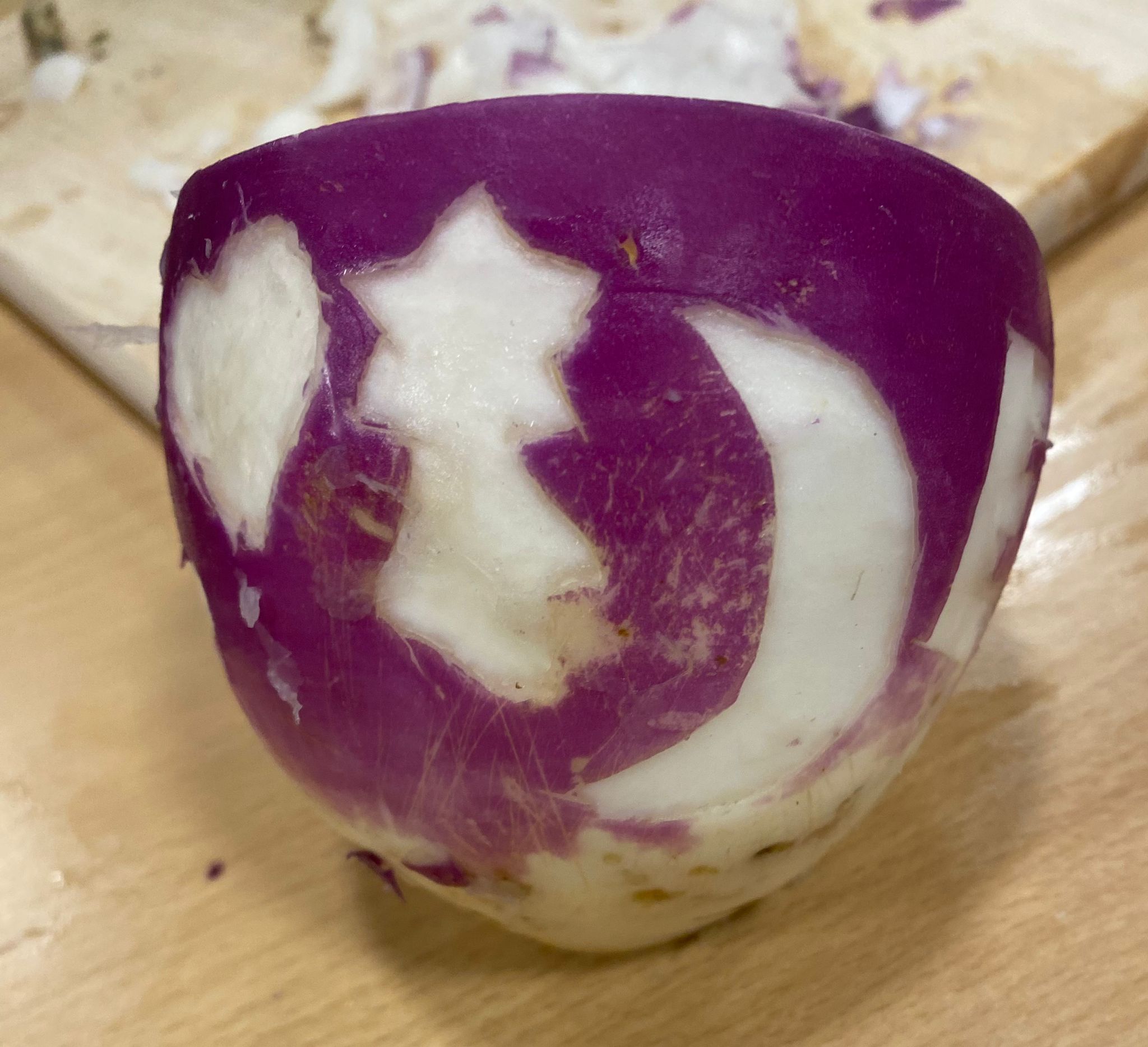 Die Räbe war fertig ausgehöhlt und ich konnte mit dem kreativen Teil beginnen. Elena konnte sich aussuchen was sie für ein Muster haben will. Mit einem Keksausstecher habe ich die Form auf die Räbe gedrückt und danach mit einem Schnitzer die Haut weg geschnitten. Ich schnitzte auch noch ihren Namen darauf.