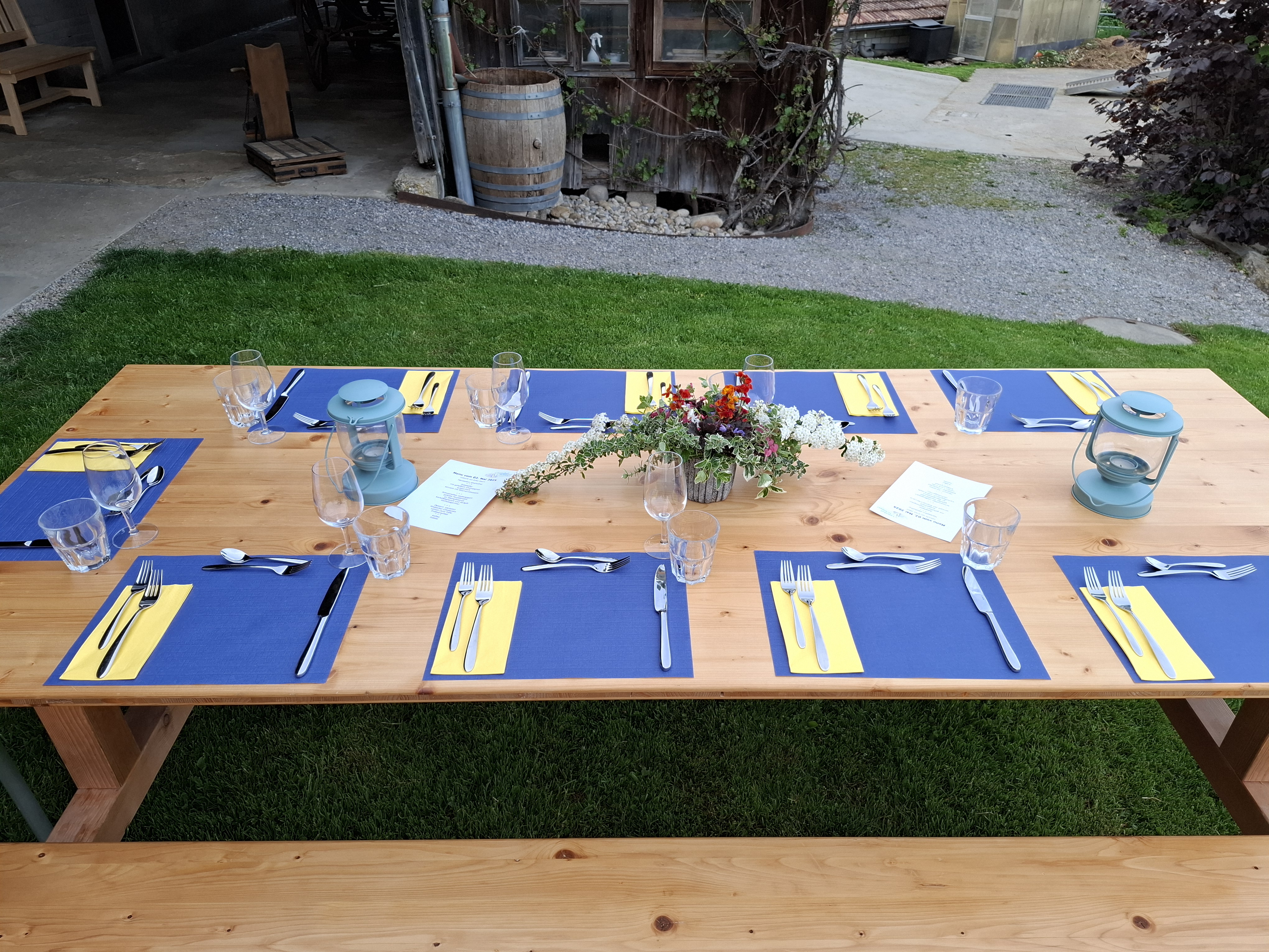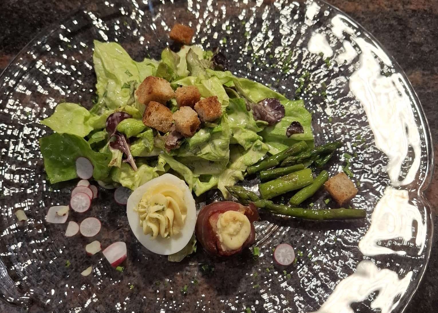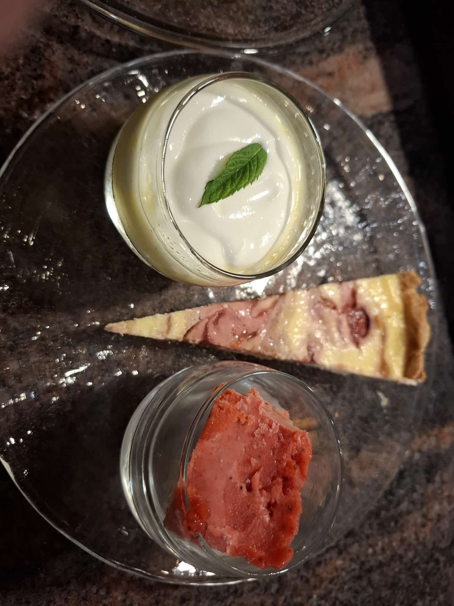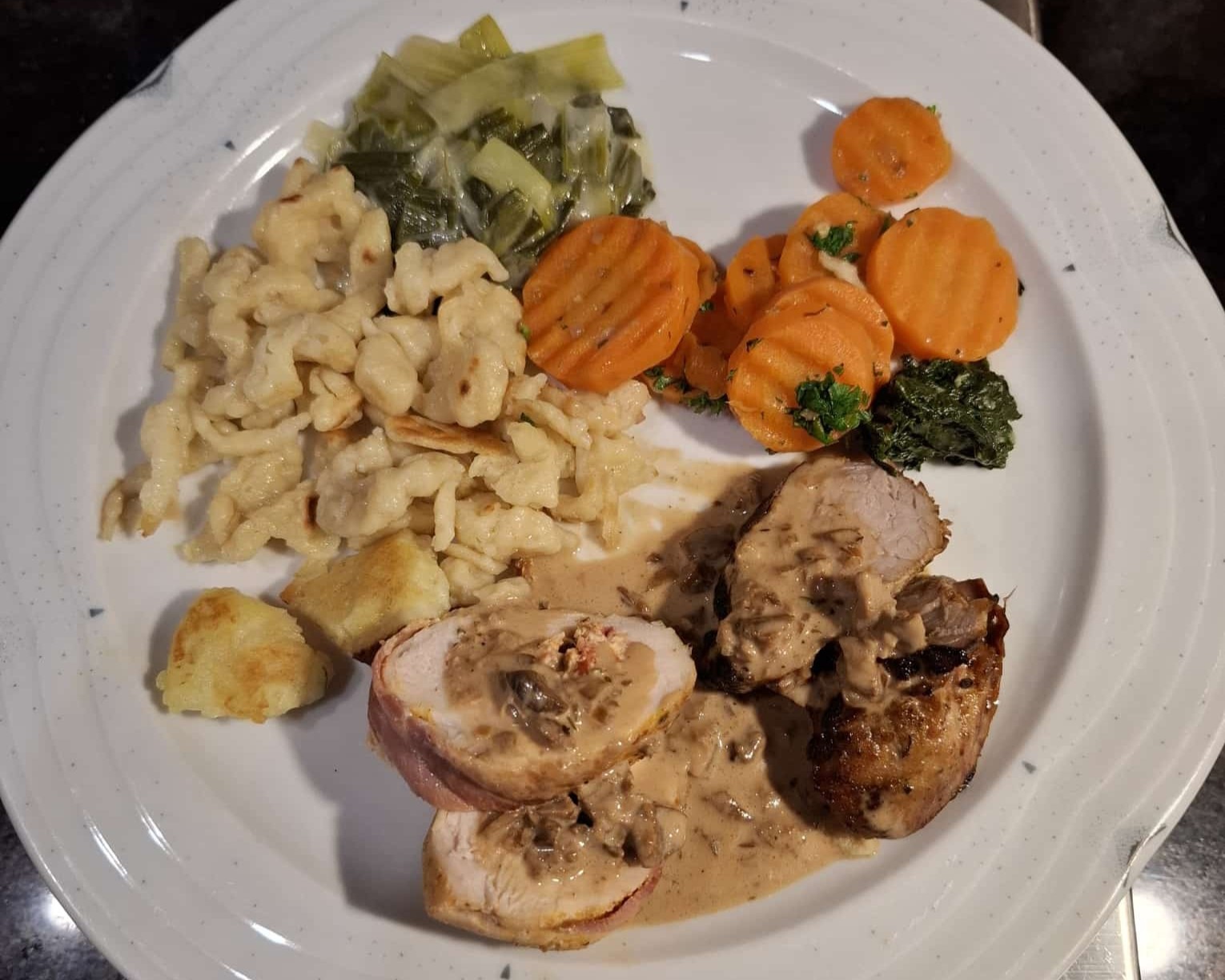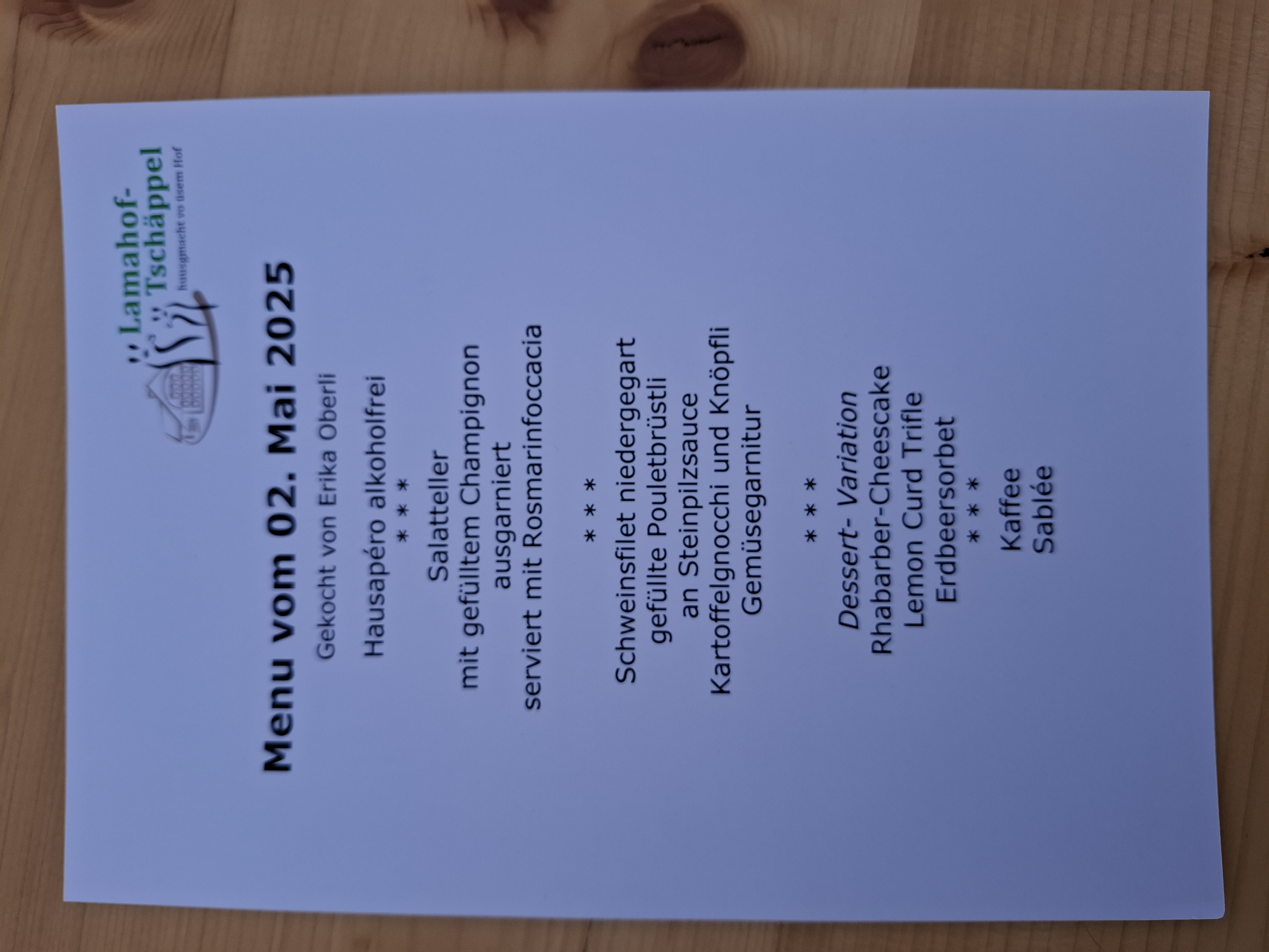 Am 02.05.2025 durfte ich auf dem Lehrbetrieb bei Familie Walker meinen Eltern ein Menu servieren. Insgesamt stand ich 1 1/2 Tage nur in der Küche. Zur Vorspeise habe ich ein Salatteller mit gefüllten Champignon mit Rosmarinfoccacia hergerichtet. Zum Hauptgang gab es Schweinsfilet niedergegart, gefüllte Pouletbrüstli an Steinpilzsauce, Kartoffelgnocchi und Knöpfli mit einer Gemüsegarnitur. Als Dessert - Variation stellte ich Rhabarber-Cheesecake, Lemon Curd Trifle und ein Erdbeersorbet her. Und den Abschluss machte Kaffee mit Sablée. Meine Eltern fanden das Menu ausgezeichnet und genossen es sehr.